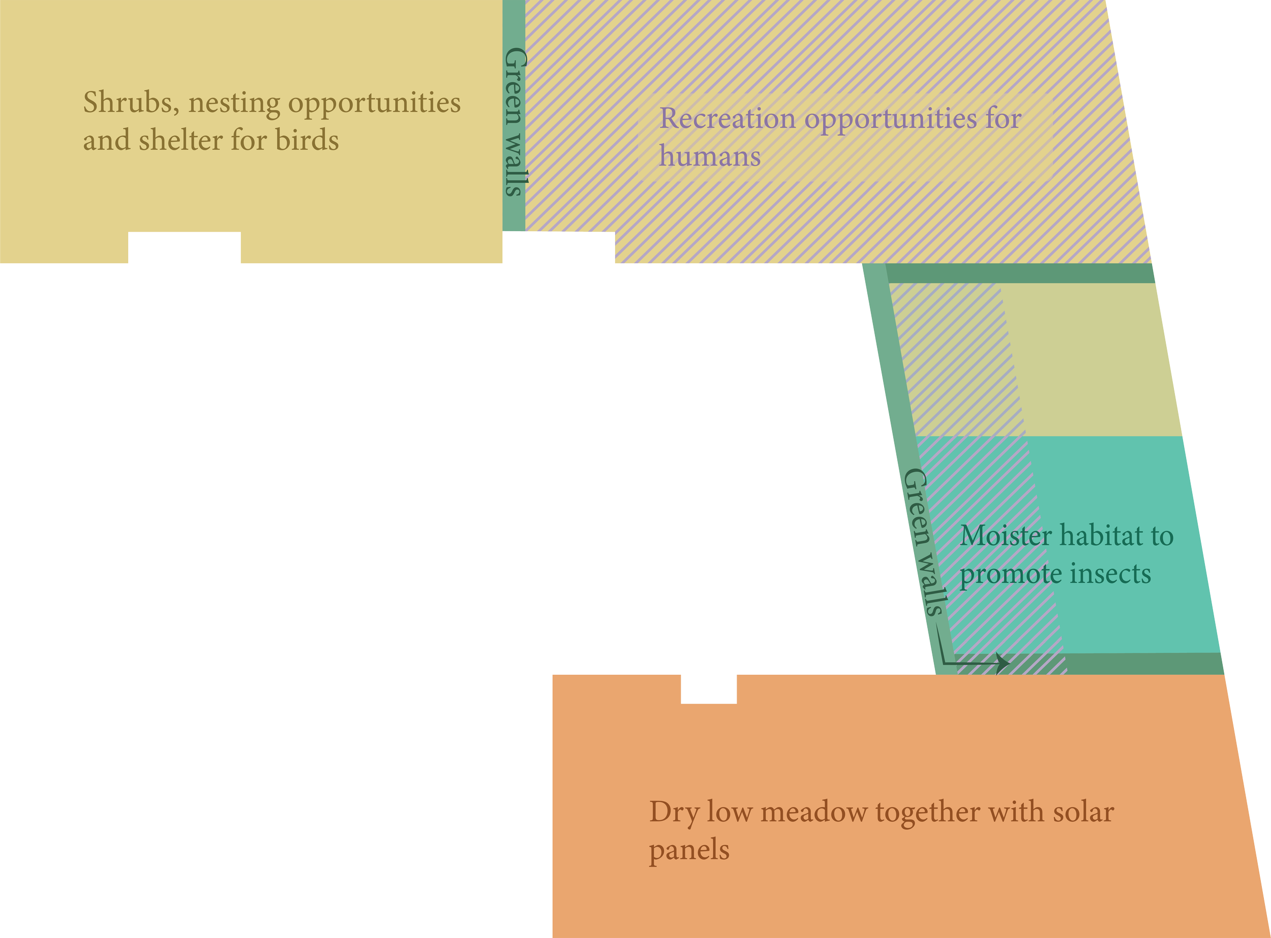 I det här projektet samarbetade jag med Louise Zetterling kring att gestalta gröna tak med fokus på urban ekologi. Vårt samarbete fungerade mycket bra där vi kompletterade varandra väl och hade dessutom väldigt roligt under processen. Zetterling ansvarade för sektionerna, SketchUp-modellen och perspektivbilden, som krävde extra tid för att bli mer iögonfallande. Själv tog jag fram illustrationsplanen, PowerPoint-presentationen, växtlistan samt material- och diagramunderlag för att förklara vårt koncept. Bland annat bröt jag ner Zetterlings sektioner för att tydliggöra konceptets delar, (animeringen till höger) och använde GIS som stöd i underlagsarbetet.